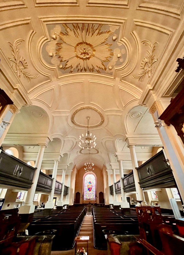 The interior is marked with grand tall white wooden columns and has an unusual ceiling described in Historic England’s listing as a, “richly panelled barrel vault,” a feature which helped to granted the church its highest heritage rating. The revised Pevsner guide describes the interior as having similarities to, “Wren’s system at St James, Piccadilly,” regretting that the church had not been more prominently placed in the town.